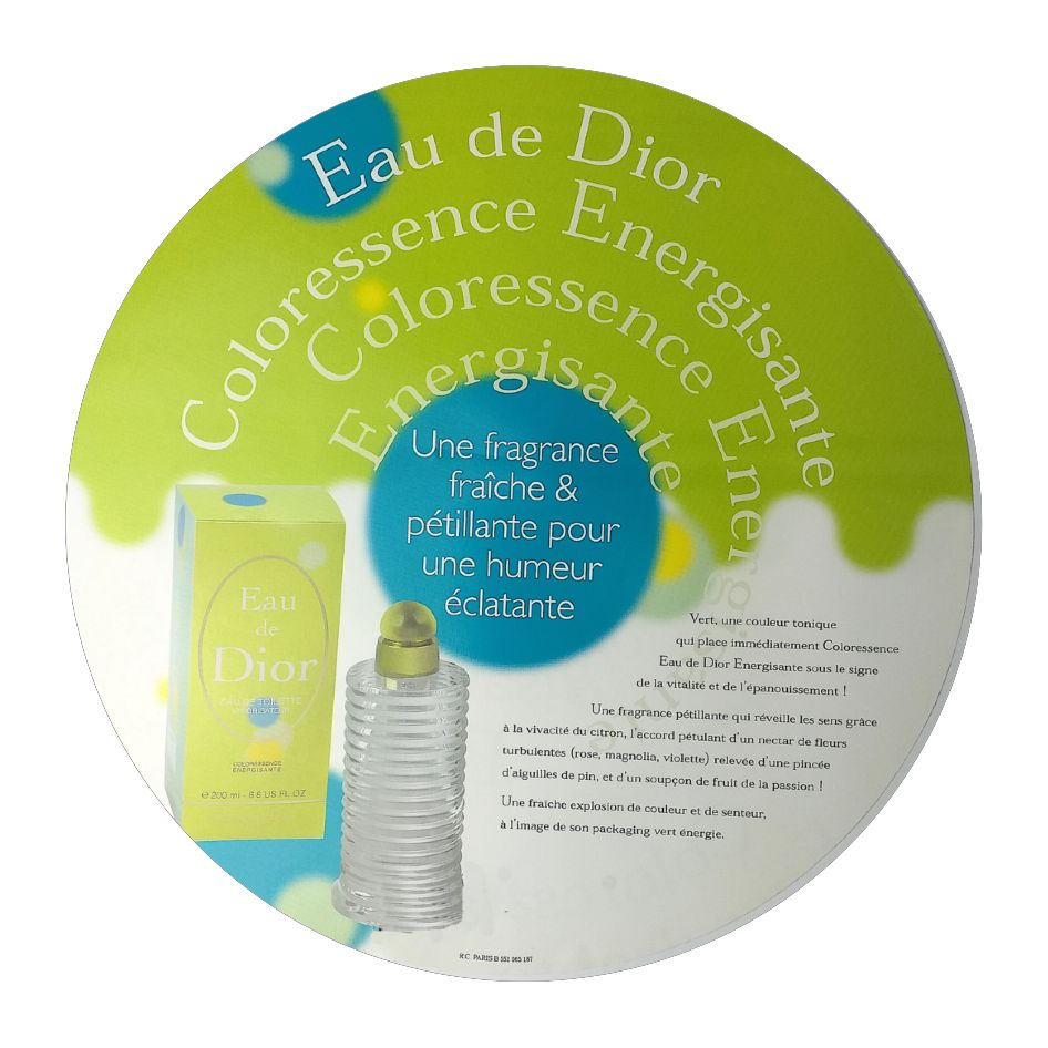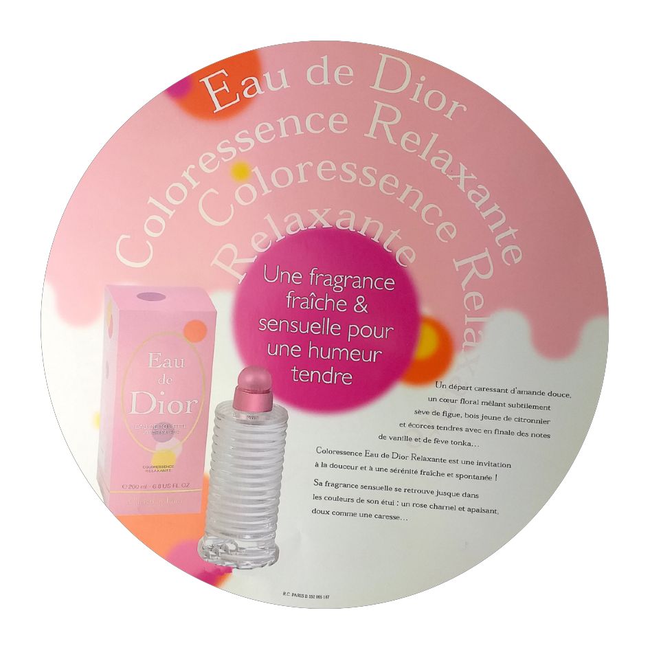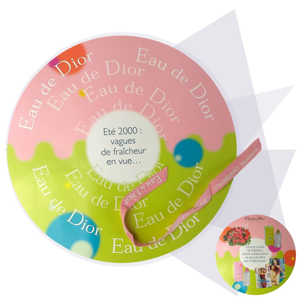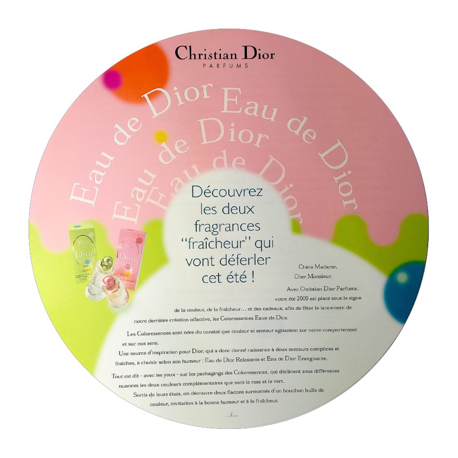 L’union d’un rose sensuel et d’un vert pétillant pour le lancement de ces Eau de Dior auprès des revendeurs. Grands leaflets tout ronds parvenus aux destinataires dans une grande boîte, évocation d’une tendre complicité dont le fil pour animer l’action n’était autre qu’un bracelet brésilien évoquant cette nouvelle fragrance.